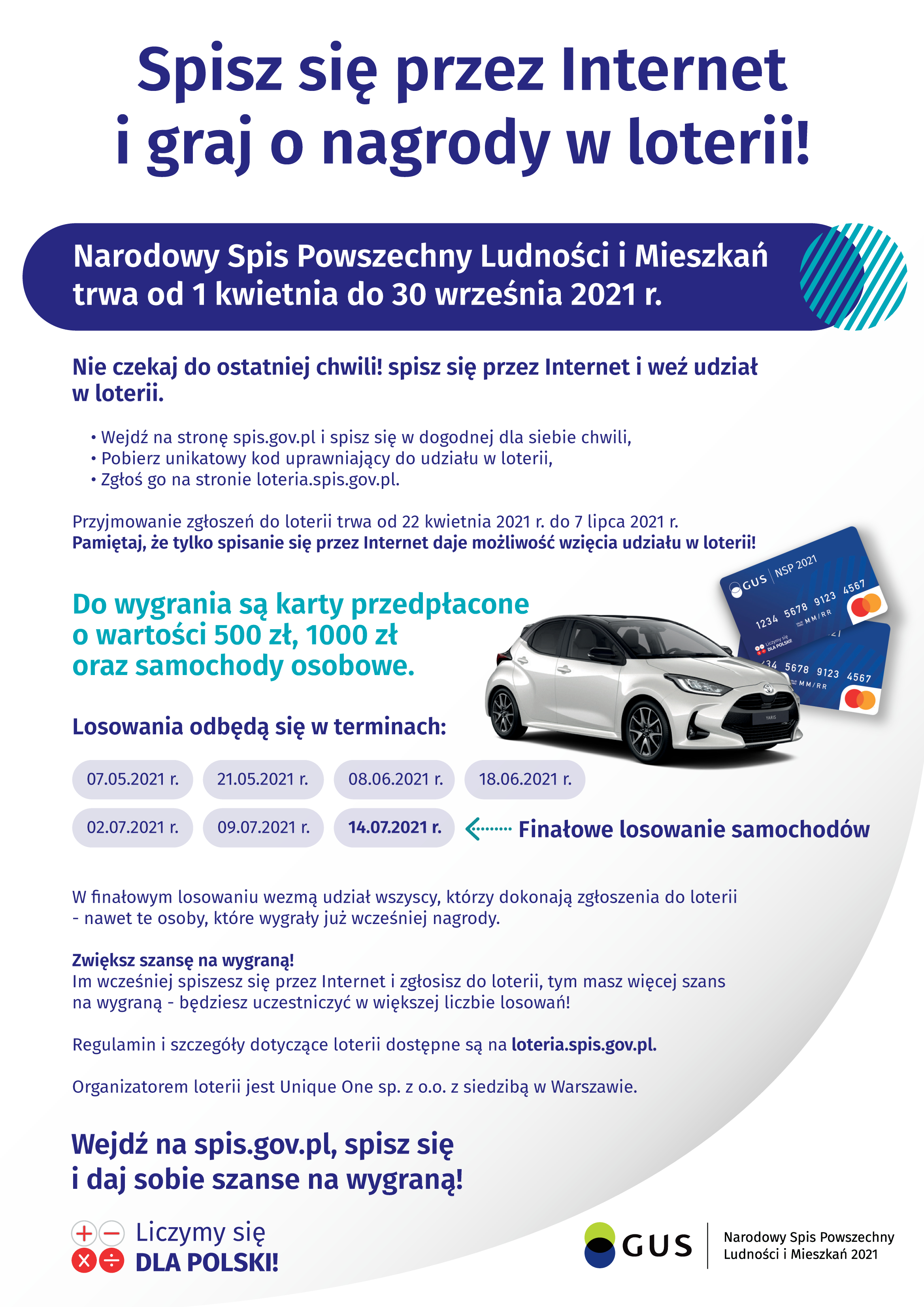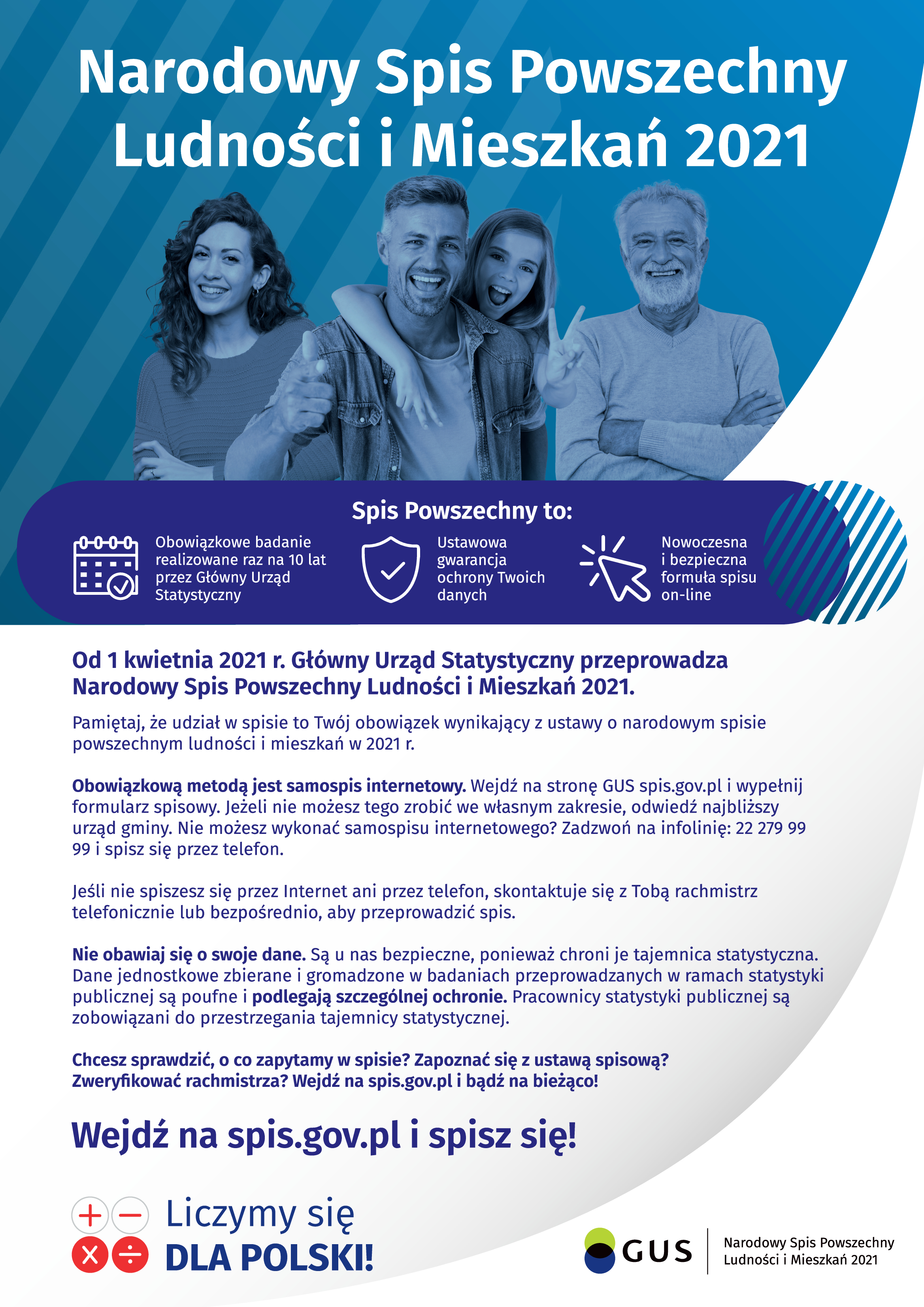 Do 30 września trwa Narodowy Spis Powszechny Ludności i Mieszkań 2021. Obowiązkową formą udziału w badaniu jest samospis przez Internet. Możemy go zrealizować samodzielnie na własnym urządzeniu elektronicznym – komputerze, tablecie, smartfonie lub w punktach spisowych zorganizowanych m.in. przez urzędy gmin. Możemy też zadzwonić na infolinię 22 279 99 99 i wybrać opcję „Spis na żądanie”, wtedy spisze nas rachmistrz telefoniczny – od razu lub w umówionym terminie. Od maja pracują też rachmistrze, którzy aż do teraz wykonywali swoje zadania wyłącznie telefonicznie. Dzwonią oni do mieszkańców województwa z numeru 22 828 88 88 lub numeru infolinii. Już od 23 czerwca będziemy mogli spotkać ich w swojej miejscowości. Ruszają do pracy w terenie by umożliwić wypełnienie obowiązku spisowego wszystkim tym, którzy – z różnych względów – nie mogli tego uczynić przez Internet lub telefonicznie.